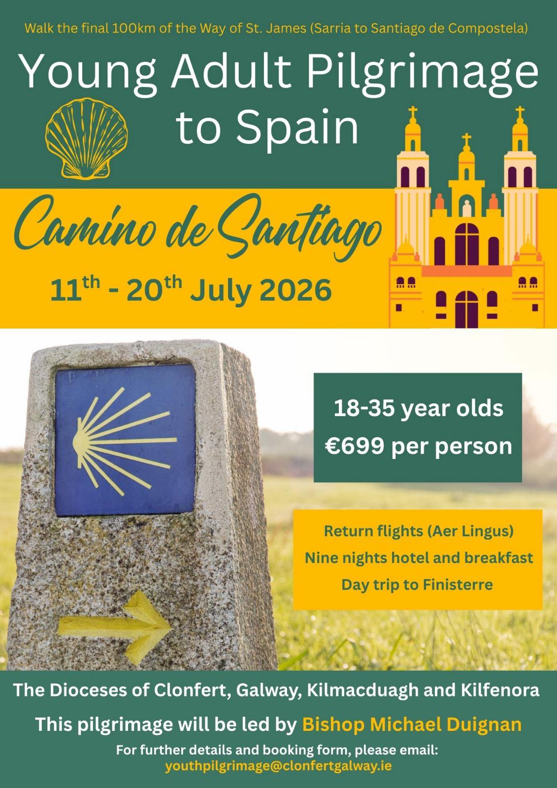 Young Adult Camino Pilgrimage: Join this year’s Young Adult Camino Pilgrimage (ages 18–35), from 11th to 20th July 2026. Walk the final 100km from Sarria to Santiago with Bishop Michael Duignan. Step out in faith and experience the grace of the Camino. Includes flights, accommodation, and visit to Finisterre. See clonfertgalway.ie/camino-to-santiago for further information.